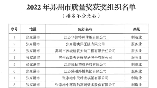 近期,蘇州市質(zhì)量獎(jiǎng)評(píng)定委員會(huì)公布了2022年蘇州市質(zhì)量獎(jiǎng)獲獎(jiǎng)組織名單,張家港市11家企業(yè)榜上有名,其中,科堡品牌母公司張家港中天精密模塑有限公司榜上有名。